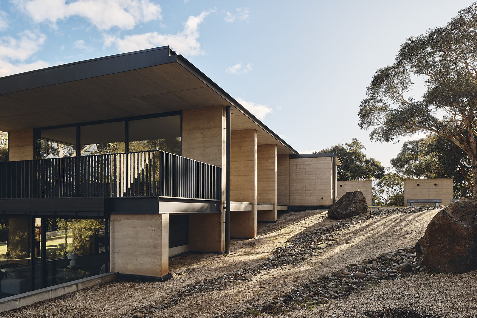 Dense bushland nestles Aireys House between the eucalyptus and blackwood trees, midway between sea and sky. Named simply after the Aireys inlet it overlooks, its externally recessed fixed glass and rammed earth fin walls create rhythmic frames and transparent views of the horizon, inviting one to meditate on the untouched vegetation and water without distractions.